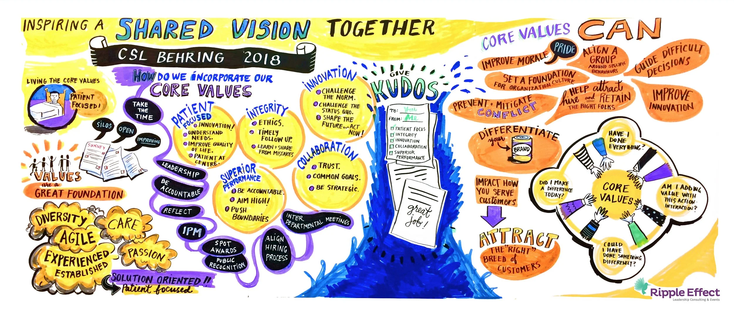 This graphic recording captured a workshop I facilitated, where we transformed their core values from words on a wall into actionable strategies. As teams collaborated and shared ideas, ThinkLink Graphics illustrated our conversation in real-time - turning abstract concepts into this vibrant visual story.